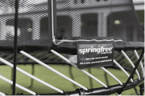 Стальная рама Springfree (БезПружин) полностью уведена под уровень прыгательной поверхности. В стандартных батутах рама расположена на уровне мата или выше — при падении на край человек ударяется о трубу диаметром 40-50 мм. В Springfree (БезПружин) рама видна только снаружи снизу. Трубы рамы покрыты порошковой краской с антикоррозийным слоем; стальные соединения соответствуют нагрузочным требованиям EN 71-14:2018.